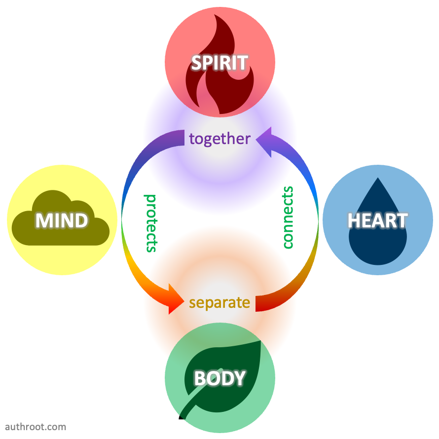 How can one find that balance between mind and heart? Part of the answer lies in recognizing that while the imbalance is between these two parts, there are two others in the system as well. Our connections to both our own bodies and to spirit are vital components in balancing our soul. And in this mind-driven culture, those two dimensions of our souls are often unhealthy as well.
